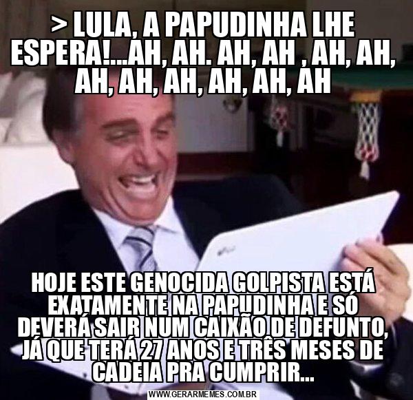 > LULA, A PAPUDINHA LHE ESPERA!...AH, AH. AH, AH , AH, AH, AH, AH, AH, AH, AH, AH HOJE ESTE GENOCIDA GOLPISTA ESTÁ EXATAMENTE NA PAPUDINHA E SÓ DEVERÁ SAIR NUM CAIXÃO DE DEFUNTO, JÁ QUE TERÁ 27 ANOS E TRÊS MESES DE CADEIA PRA CUMPRIR...