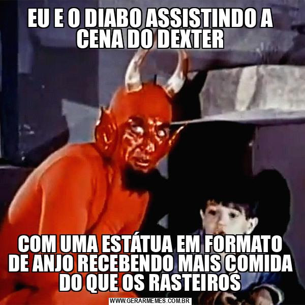 EU E O DIABO ASSISTINDO A CENA DO DEXTER COM UMA ESTÁTUA EM FORMATO DE ANJO RECEBENDO MAIS COMIDA DO QUE OS RASTEIROS