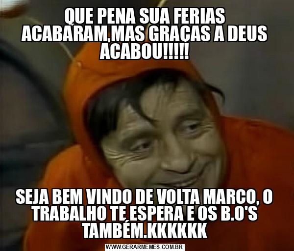QUE PENA SUA FERIAS ACABARAM,MAS GRAÇAS A DEUS ACABOU!!!!! SEJA BEM VINDO DE VOLTA MARCO, O TRABALHO TE ESPERA E OS B.O'S TAMBÉM.KKKKKK