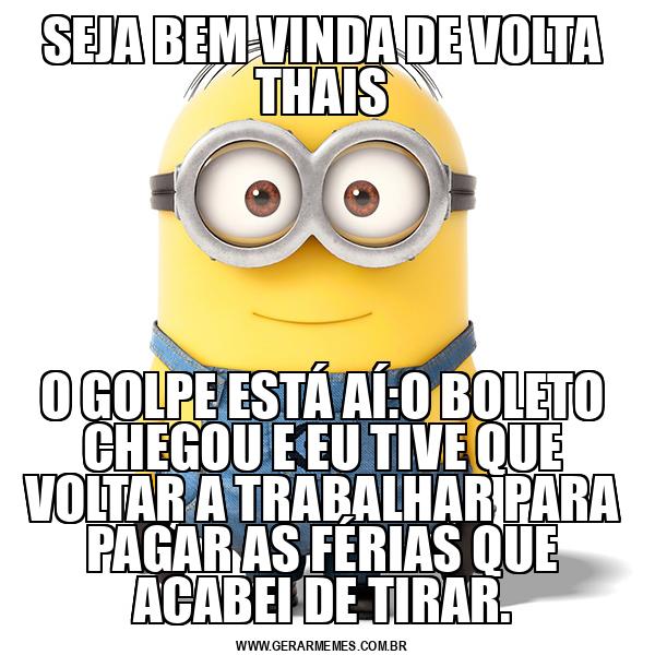 SEJA BEM VINDA DE VOLTA THAIS O GOLPE ESTÁ AÍ:O BOLETO CHEGOU E EU TIVE QUE VOLTAR A TRABALHAR PARA PAGAR AS FÉRIAS QUE ACABEI DE TIRAR.