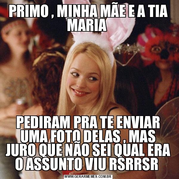 PRIMO , MINHA MÃE E A TIA MARIA PEDIRAM PRA TE ENVIAR UMA FOTO DELAS , MAS JURO QUE NÃO SEI QUAL ERA O ASSUNTO VIU RSRRSR