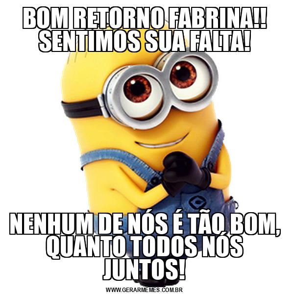 BOM RETORNO FABRINA!! SENTIMOS SUA FALTA! NENHUM DE NÓS É TÃO BOM, QUANTO TODOS NÓS JUNTOS!