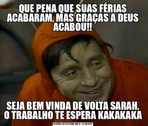 QUE PENA QUE SUAS FÉRIAS ACABARAM, MAS GRAÇAS A DEUS ACABOU!! SEJA BEM VINDA DE VOLTA SARAH, O TRABALHO TE ESPERA KAKAKAKA