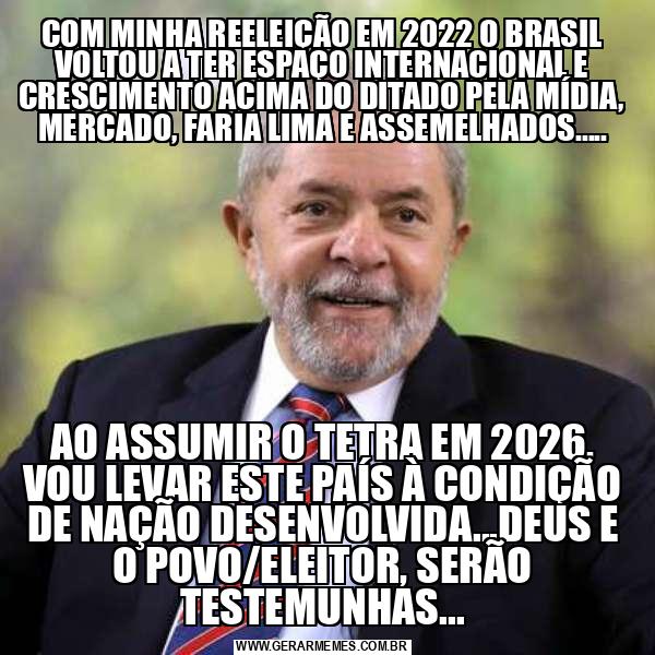 COM MINHA REELEIÇÃO EM 2022 O BRASIL VOLTOU A TER ESPAÇO INTERNACIONAL E CRESCIMENTO ACIMA DO DITADO PELA MÍDIA, MERCADO, FARIA LIMA E ASSEMELHADOS..... AO ASSUMIR O TETRA EM 2026, VOU LEVAR ESTE PAÍS À CONDIÇÃO DE NAÇÃO DESENVOLVIDA...DEUS E O POVO/ELEITOR, SERÃO TESTEMUNHAS...