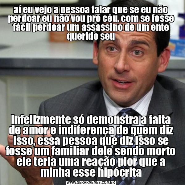 aí eu vejo a pessoa falar que se eu não perdoar eu não vou pro céu, com se fosse fácil perdoar um assassino de um ente querido seu infelizmente só demonstra a falta de amor e indiferença de quem diz isso, essa pessoa que diz isso se fosse um familiar dele sendo morto ele teria uma reação pior que a minha esse hipócrita