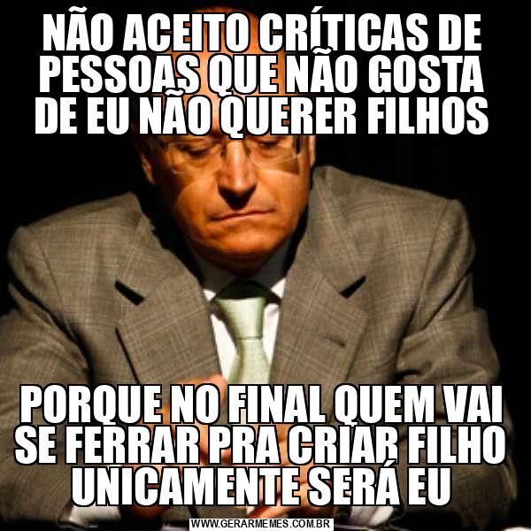 NÃO ACEITO CRÍTICAS DE PESSOAS QUE NÃO GOSTA DE EU NÃO QUERER FILHOS PORQUE NO FINAL QUEM VAI SE FERRAR PRA CRIAR FILHO UNICAMENTE SERÁ EU