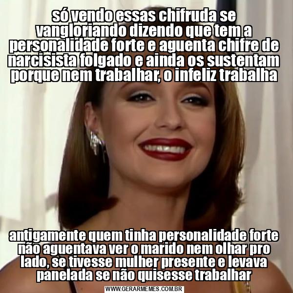 só vendo essas chifruda se vangloriando dizendo que tem a personalidade forte e aguenta chifre de narcisista folgado e ainda os sustentam porque nem trabalhar, o infeliz trabalha antigamente quem tinha personalidade forte não aguentava ver o marido nem olhar pro lado, se tivesse mulher presente e levava panelada se não quisesse trabalhar