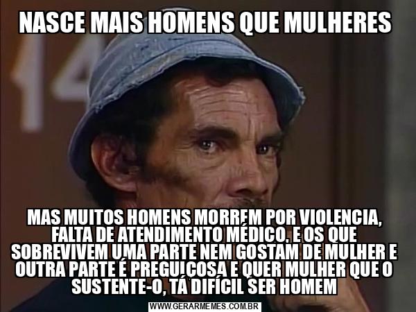 NASCE MAIS HOMENS QUE MULHERES MAS MUITOS HOMENS MORREM POR VIOLENCIA, FALTA DE ATENDIMENTO MÉDICO, E OS QUE SOBREVIVEM UMA PARTE NEM GOSTAM DE MULHER E OUTRA PARTE É PREGUIÇOSA E QUER MULHER QUE O SUSTENTE-O, TÁ DIFÍCIL SER HOMEM