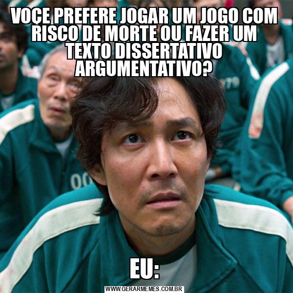 VOÇE PREFERE JOGAR UM JOGO COM RISCO DE MORTE OU FAZER UM TEXTO DISSERTATIVO ARGUMENTATIVO? EU:
