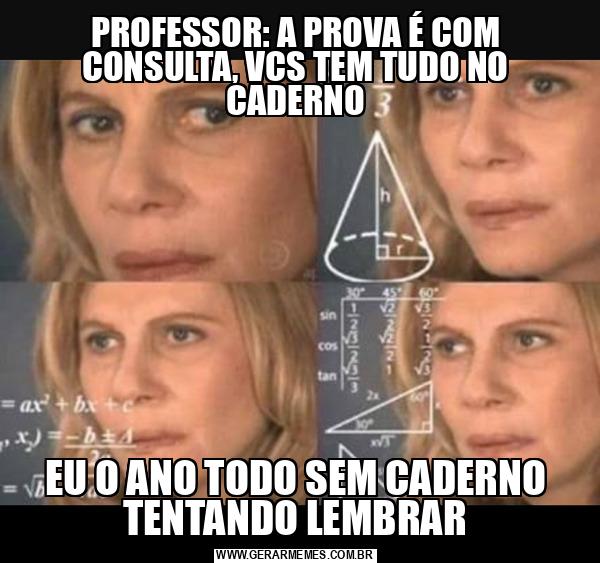 PROFESSOR: A PROVA É COM CONSULTA, VCS TEM TUDO NO CADERNO EU O ANO TODO SEM CADERNO TENTANDO LEMBRAR