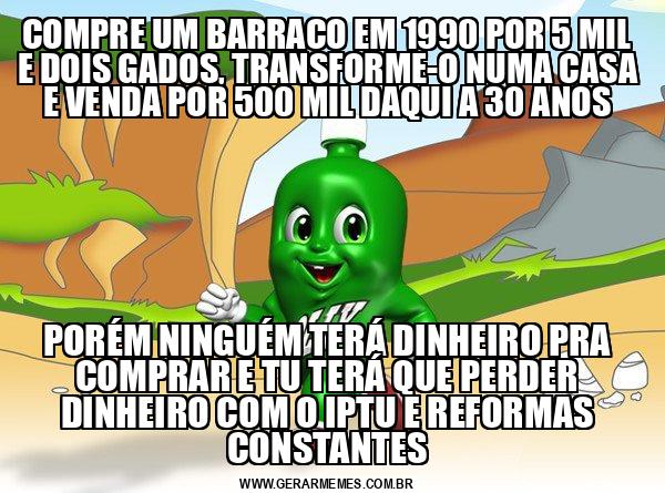 COMPRE UM BARRACO EM 1990 POR 5 MIL E DOIS GADOS, TRANSFORME-O NUMA CASA E VENDA POR 500 MIL DAQUI A 30 ANOS PORÉM NINGUÉM TERÁ DINHEIRO PRA COMPRAR E TU TERÁ QUE PERDER DINHEIRO COM O IPTU E REFORMAS CONSTANTES