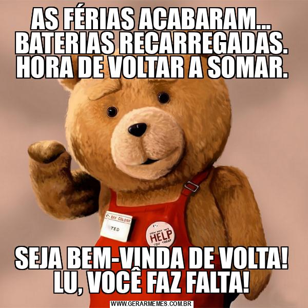 AS FÉRIAS ACABARAM... BATERIAS RECARREGADAS. HORA DE VOLTAR A SOMAR. SEJA BEM-VINDA DE VOLTA! LU, VOCÊ FAZ FALTA!
