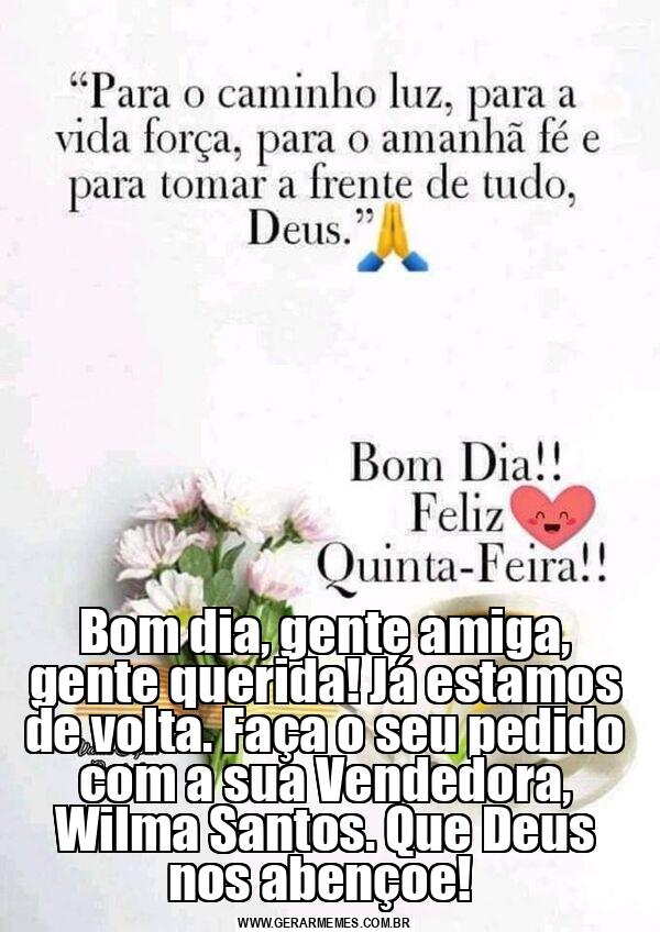 Bom dia, gente amiga, gente querida! Já estamos de volta. Faça o seu pedido com a sua Vendedora, Wilma Santos. Que Deus nos abençoe!