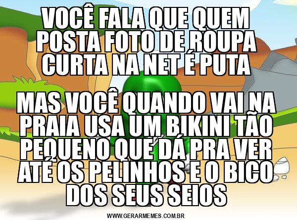 VOCÊ FALA QUE QUEM POSTA FOTO DE ROUPA CURTA NA NET É PUTA MAS VOCÊ QUANDO VAI NA PRAIA USA UM BIKINI TÃO PEQUENO QUE DÁ PRA VER ATÉ OS PELINHOS E O BICO DOS SEUS SEIOS
