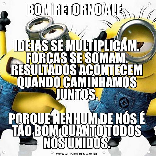 BOM RETORNO ALE IDEIAS SE MULTIPLICAM. FORÇAS SE SOMAM. RESULTADOS ACONTECEM QUANDO CAMINHAMOS JUNTOS. PORQUE NENHUM DE NÓS É TÃO BOM QUANTO TODOS NÓS UNIDOS.
