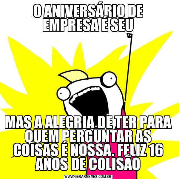 O ANIVERSÁRIO DE EMPRESA É SEU MAS A ALEGRIA DE TER PARA QUEM PERGUNTAR AS COISAS É NOSSA. FELIZ 16 ANOS DE COLISÃO