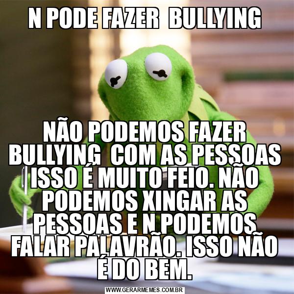 N PODE FAZER BULLYING NÃO PODEMOS FAZER BULLYING COM AS PESSOAS ISSO É MUITO FEIO. NÃO PODEMOS XINGAR AS PESSOAS E N PODEMOS FALAR PALAVRÃO. ISSO NÃO É DO BEM.