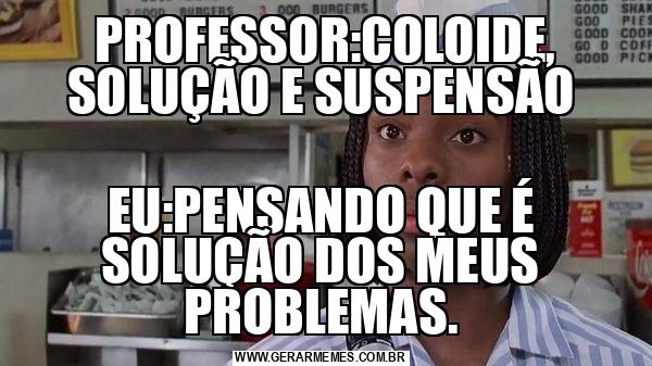 PROFESSOR:COLOIDE, SOLUÇÃO E SUSPENSÃO EU:PENSANDO QUE É SOLUÇÃO DOS MEUS PROBLEMAS.