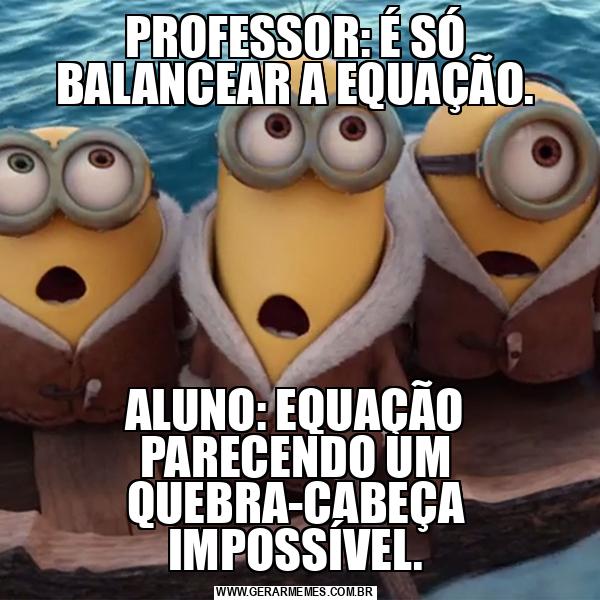 PROFESSOR: É SÓ BALANCEAR A EQUAÇÃO. ALUNO: EQUAÇÃO PARECENDO UM QUEBRA-CABEÇA IMPOSSÍVEL.