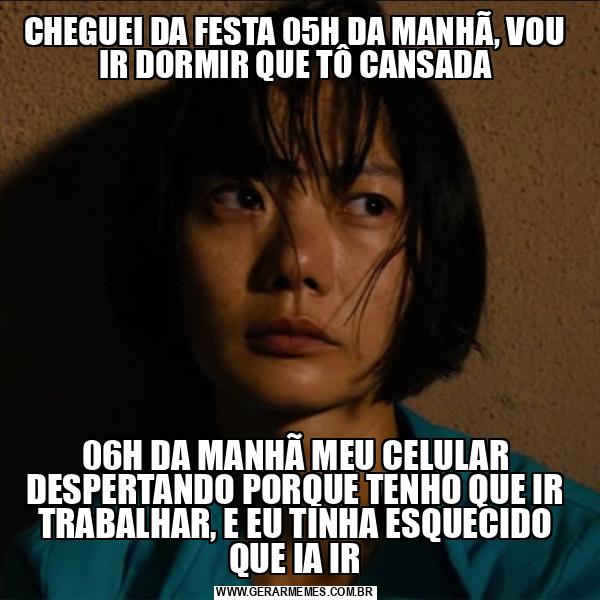 CHEGUEI DA FESTA 05H DA MANHÃ, VOU IR DORMIR QUE TÔ CANSADA 06H DA MANHÃ MEU CELULAR DESPERTANDO PORQUE TENHO QUE IR TRABALHAR, E EU TINHA ESQUECIDO QUE IA IR