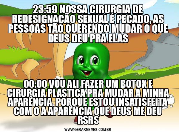 23:59 NOSSA CIRURGIA DE REDESIGNAÇÃO SEXUAL É PECADO, AS PESSOAS TÃO QUERENDO MUDAR O QUE DEUS DEU PRA ELAS 00:00 VOU ALI FAZER UM BOTOX E CIRURGIA PLASTICA PRA MUDAR A MINHA APARÊNCIA, PORQUE ESTOU INSATISFEITA COM O A APARÊNCIA QUE DEUS ME DEU RSRS