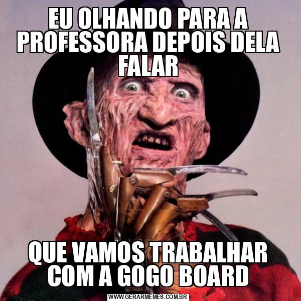 EU OLHANDO PARA A PROFESSORA DEPOIS DELA FALAR QUE VAMOS TRABALHAR COM A GOGO BOARD