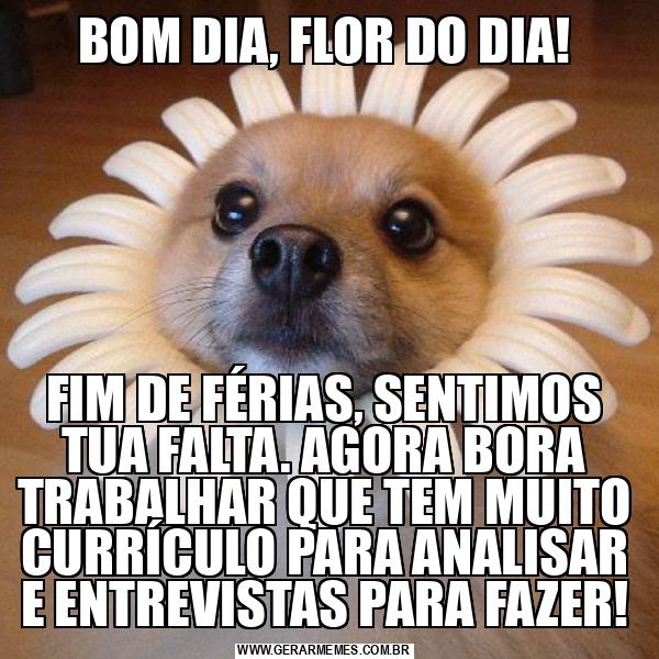 BOM DIA, FLOR DO DIA! FIM DE FÉRIAS, SENTIMOS TUA FALTA. AGORA BORA TRABALHAR QUE TEM MUITO CURRÍCULO PARA ANALISAR E ENTREVISTAS PARA FAZER!