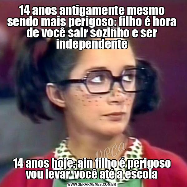 14 anos antigamente mesmo sendo mais perigoso: filho é hora de você sair sozinho e ser independente 14 anos hoje: ain filho é perigoso vou levar você até a escola