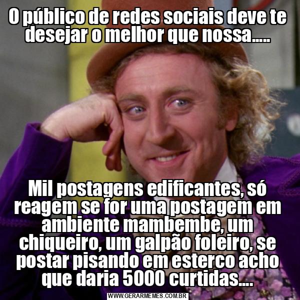 O público de redes sociais deve te desejar o melhor que nossa..... Mil postagens edificantes, só reagem se for uma postagem em ambiente mambembe, um chiqueiro, um galpão foleiro, se postar pisando em esterco acho que daria 5000 curtidas....