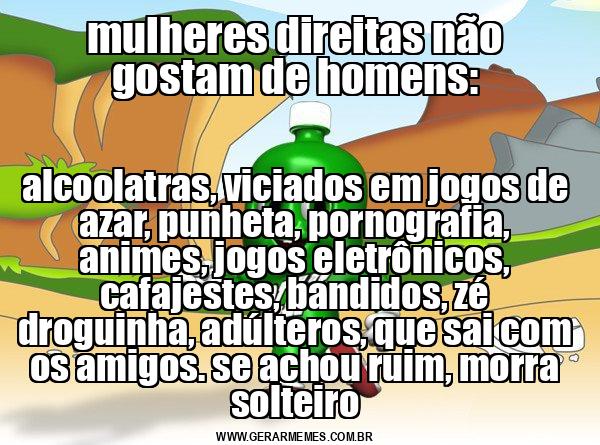 mulheres direitas não gostam de homens: alcoolatras, viciados em jogos de azar, punheta, pornografia, animes, jogos eletrônicos, cafajestes, bandidos, zé droguinha, adúlteros, que sai com os amigos. se achou ruim, morra solteiro