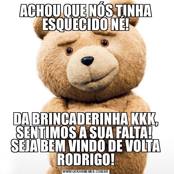 ACHOU QUE NÓS TINHA ESQUECIDO NÉ! DA BRINCADERINHA KKK, SENTIMOS A SUA FALTA! SEJA BEM VINDO DE VOLTA RODRIGO!