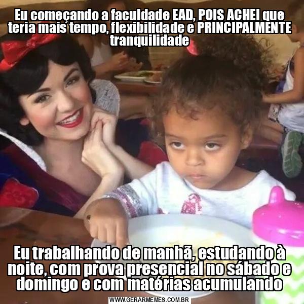 Eu começando a faculdade EAD, POIS ACHEI que teria mais tempo, flexibilidade e PRINCIPALMENTE tranquilidade Eu trabalhando de manhã, estudando à noite, com prova presencial no sábado e domingo e com matérias acumulando