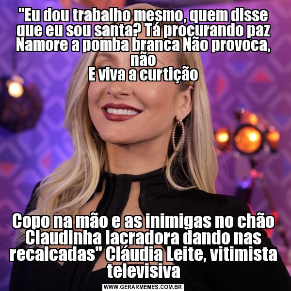 "Eu dou trabalho mesmo, quem disse que eu sou santa? Tá procurando paz Namore a pomba branca Não provoca, não E viva a curtição Copo na mão e as inimigas no chão Claudinha lacradora dando nas recalcadas" Cláudia Leite, vitimista televisiva