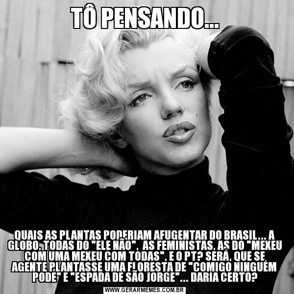 TÔ PENSANDO... QUAIS AS PLANTAS PODERIAM AFUGENTAR DO BRASIL... A GLOBO, TODAS DO "ELE NÃO", AS FEMINISTAS, AS DO "MEXEU COM UMA MEXEU COM TODAS", E O PT? SERÁ, QUE SE AGENTE PLANTASSE UMA FLORESTA DE "COMIGO NINGUÉM PODE" E "ESPADA DE SÃO JORGE"... DARIA CERTO?