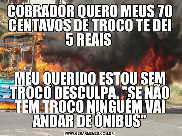 COBRADOR QUERO MEUS 70 CENTAVOS DE TROCO TE DEI 5 REAIS MEU QUERIDO ESTOU SEM TROCO DESCULPA. "SE NÃO TEM TROCO NINGUÉM VAI ANDAR DE ÔNIBUS"