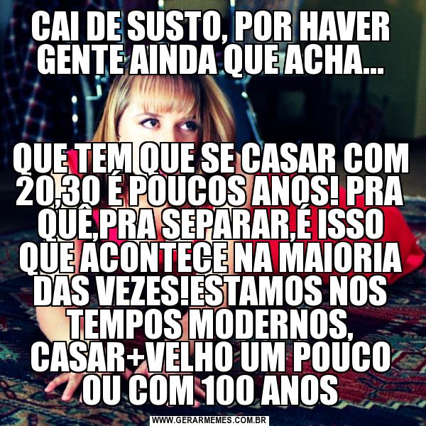 CAI DE SUSTO, POR HAVER GENTE AINDA QUE ACHA... QUE TEM QUE SE CASAR COM 20,30 É POUCOS ANOS! PRA QUÊ,PRA SEPARAR,É ISSO QUE ACONTECE NA MAIORIA DAS VEZES!ESTAMOS NOS TEMPOS MODERNOS, CASAR+VELHO UM POUCO OU COM 100 ANOS
