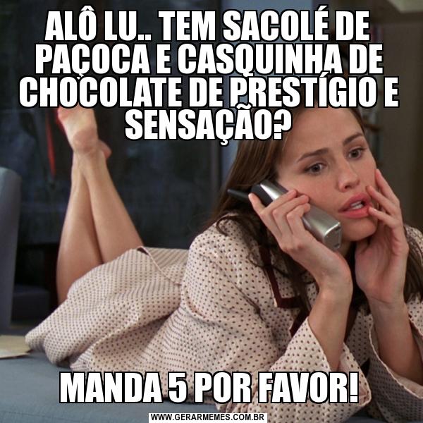 ALÔ LU.. TEM SACOLÉ DE PAÇOCA E CASQUINHA DE CHOCOLATE DE PRESTÍGIO E SENSAÇÃO? MANDA 5 POR FAVOR!