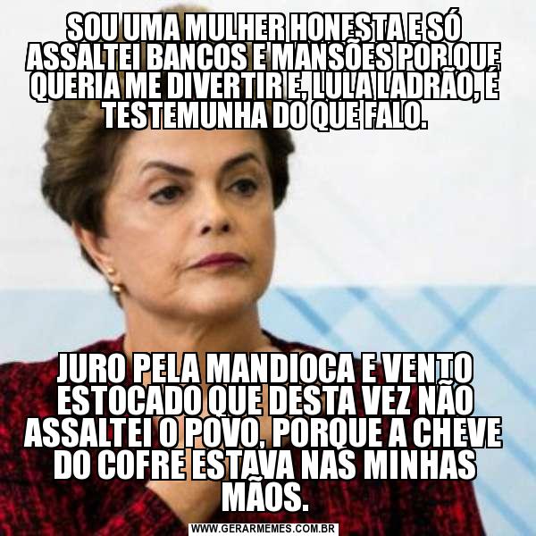 SOU UMA MULHER HONESTA E SÓ ASSALTEI BANCOS E MANSÕES POR QUE QUERIA ME DIVERTIR E, LULA LADRÃO, É TESTEMUNHA DO QUE FALO. JURO PELA MANDIOCA E VENTO ESTOCADO QUE DESTA VEZ NÃO ASSALTEI O POVO, PORQUE A CHEVE DO COFRE ESTAVA NAS MINHAS MÃOS.