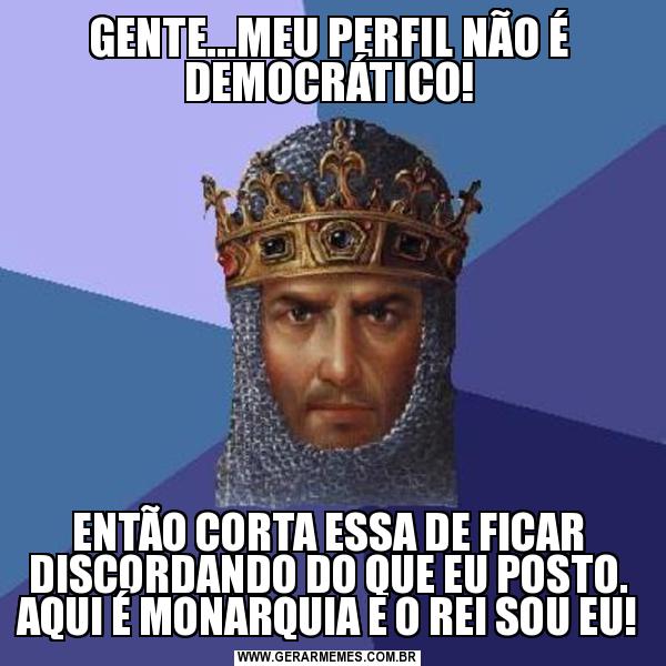 GENTE...MEU PERFIL NÃO É DEMOCRÁTICO! ENTÃO CORTA ESSA DE FICAR DISCORDANDO DO QUE EU POSTO. AQUI É MONARQUIA E O REI SOU EU!