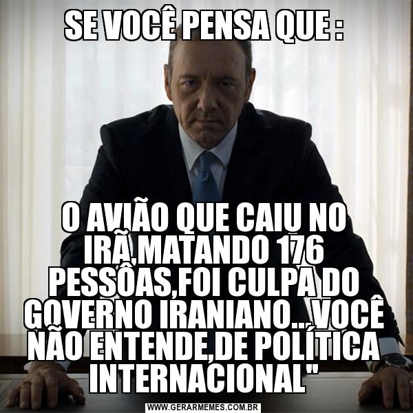 SE VOCÊ PENSA QUE : O AVIÃO QUE CAIU NO IRÃ,MATANDO 176 PESSÔAS,FOI CULPA DO GOVERNO IRANIANO...VOCÊ NÃO ENTENDE,DE POLÍTICA INTERNACIONAL"