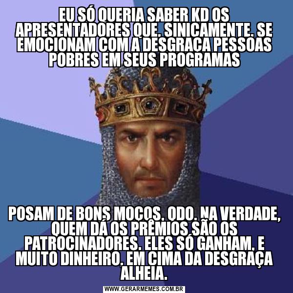 EU SÓ QUERIA SABER KD OS APRESENTADORES QUE, SINICAMENTE, SE EMOCIONAM COM A DESGRAÇA PESSOAS POBRES EM SEUS PROGRAMAS POSAM DE BONS MOÇOS, QDO, NA VERDADE, QUEM DÁ OS PRÊMIOS SÃO OS PATROCINADORES. ELES SÓ GANHAM, E MUITO DINHEIRO, EM CIMA DA DESGRAÇA ALHEIA.