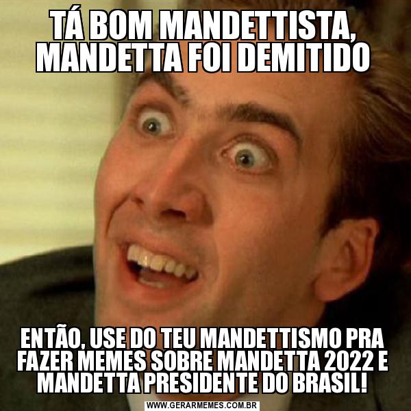 TÁ BOM MANDETTISTA, MANDETTA FOI DEMITIDO ENTÃO, USE DO TEU MANDETTISMO PRA FAZER MEMES SOBRE MANDETTA 2022 E MANDETTA PRESIDENTE DO BRASIL!
